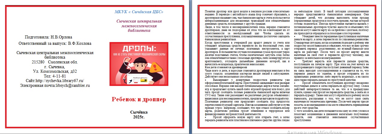 Ребенок и дроппер: буклет / МКУК «Сычёвская ЦБС», Сычёвская центральная межпоселенческая библиотека; сост. Н.В. Орлова; отв. за вып. В.Ф.Козлова. – Сычёвка: [б.и.], 2025. – 4 с. Тираж 25 экз