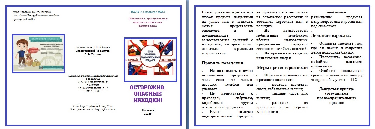 Осторожно, опасные находки!: буклет / МКУК «Сычёвская ЦБС», Сычёвская центральная межпоселенческая библиотека; сост. Н.В. Орлова; отв. за вып. В.Ф.Козлова. – Сычёвка: [б.и.], 2025. – 4 с. Тираж 25 экз.