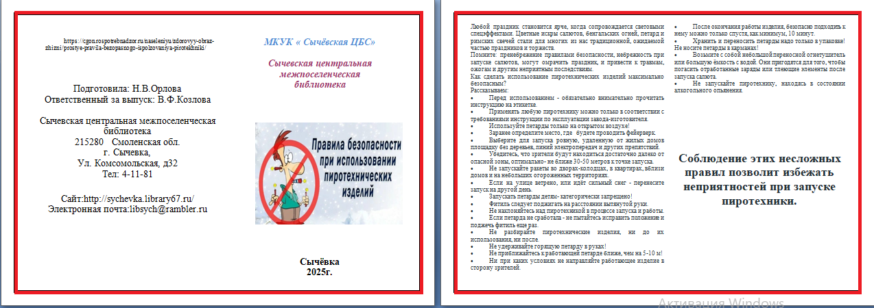 Правила безопасности пи использовании пиротехнических изделий: памятка / МКУК «Сычёвская ЦБС», Сычёвская центральная межпоселенческая библиотека; сост. Н.В. Орлова; отв. за вып. В.Ф.Козлова. – Сычёвка: [б.и.], 2025. – 4 с. Тираж 25 экз.