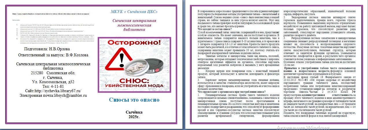 Снюс это опасно : памятка / МКУК «Сычёвская ЦБС», Сычёвская центральная межпоселенческая библиотека; сост. Н.В. Орлова; отв. за вып. В.Ф.Козлова. – Сычёвка: [б.и.], 2025. – 4 с. Тираж 25 экз.