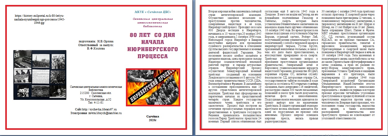80 лет со дня начала Нюрнберского процесса 1945 -1946гг.: буклет / МКУК «Сычёвская ЦБС», Сычёвская центральная межпоселенческая библиотека; сост. Н.В. Орлова; отв. за вып. В.Ф.Козлова. – Сычёвка: [б.и.], 2025. – 2 с. Тираж 25 экз.