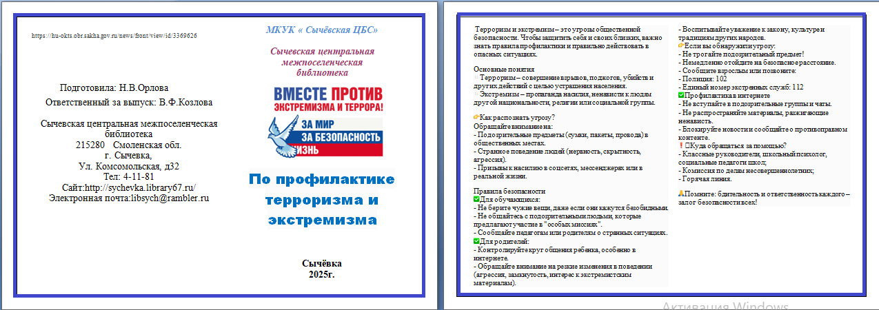 По профилактике терроризма и экстремизма: памятка / МКУК «Сычёвская ЦБС», Сычёвская центральная межпоселенческая библиотека; сост. Н.В. Орлова; отв. за вып. В.Ф.Козлова. – Сычёвка: [б.и.], 2025. – 4 с. Тираж 25 экз.