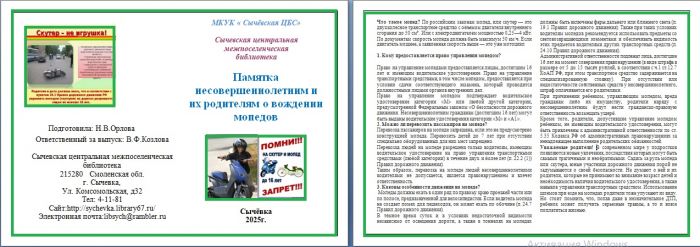Памятка несовершеннолетним и их родителям о вождении мопедов : памятка / МКУК «Сычёвская ЦБС», Сычёвская центральная межпоселенческая библиотека; сост. Н.В. Орлова; отв. за вып. В.Ф.Козлова. – Сычёвка: [б.и.], 2025. – 4 с. Тираж 25 экз.