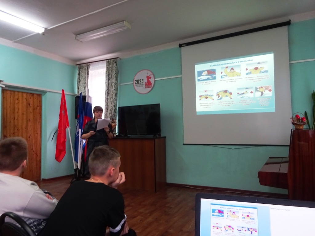 Мероприятие было посвящено правилам поведения на реках и озерах в зимний период года, опасным факторам водоемов, способами безопасного передвижения по льду, изучению основных причин, которые могут привести к опасным и чрезвычайным ситуациям. Урок был дополнен красочной презентацией и несколькими поучительными видеороликами «Энциклопедия безопасности» и «Правила нахождения на льду». Также с ребятам была проведена викторина на усвоение материала.