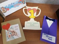 Затем был проведён мастер – класс по изготовлению открытки. Подарки, сделанные своими руками, получились красивыми и праздничными. Ребята забрали их с собой, чтобы дома вручить их своим любимым папам.
