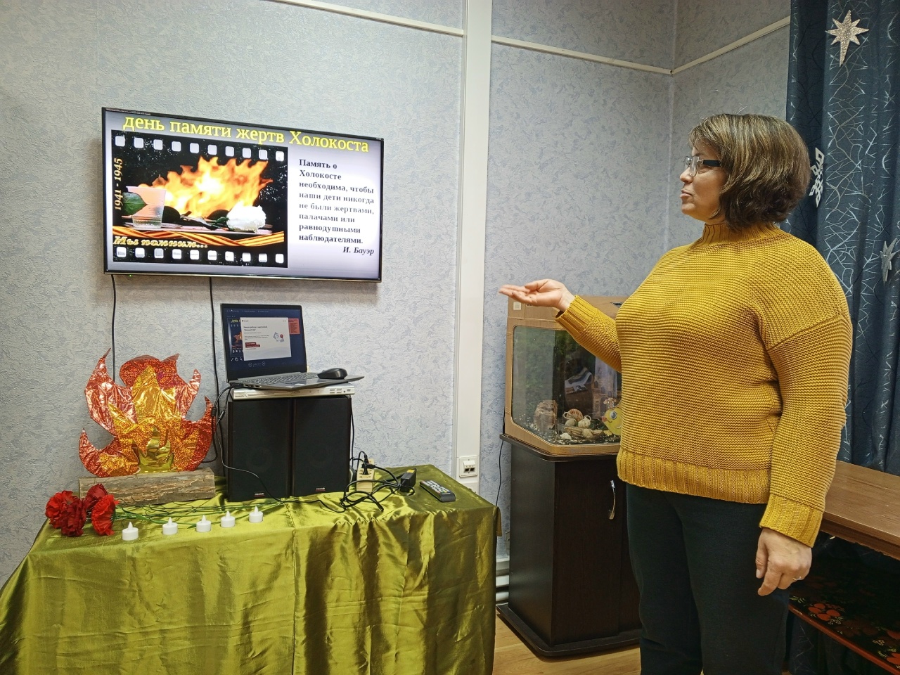 Ежегодно 27 января весь мир отмечает Международный день памяти жертв Холокоста. В детской библиотеке прошло мероприятие, посвященное этому трагическому событию. Библиотекарь А.М. Маевская рассказала о значении слова «Холокост» и о том, какие меры принимали против евреев после оккупации Германии. Она также объяснила, сколько законов было введено Гитлером для «очистки» страны от евреев. Зверства фашистов и их пособников продолжались с 1933 по 1945 год, когда нацисты уничтожили около шести миллионов евреев, находившихся в гетто и лагерях смерти по всей Европе. Мероприятие сопровождалось презентацией и просмотром документальных и художественных видеороликов.