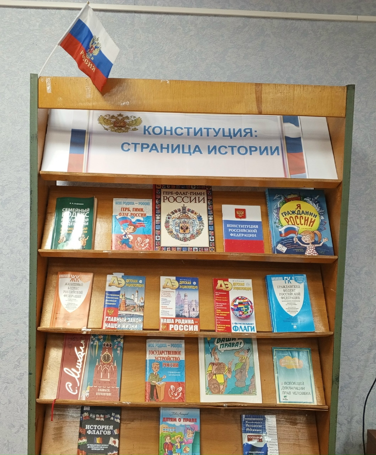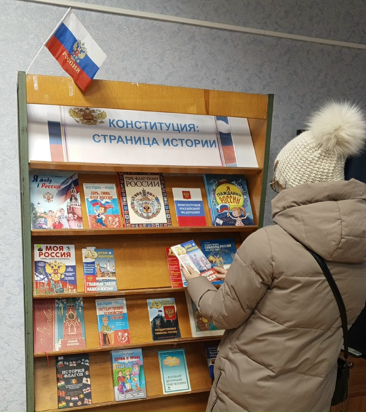 В детской библиотеке ко Дню Конституции организована книжная выставка под названием «Конституция: страница истории». На этой выставке представлена литература, рассчитанная на широкий круг читателей, и включает материалы, рассказывающие об истории создания Конституции, основах конституционного строя и главных законах государства. Центральное место на выставке занимает Конституция Российской Федерации, а также кодексы, регулирующие уголовное, гражданское и семейное право.