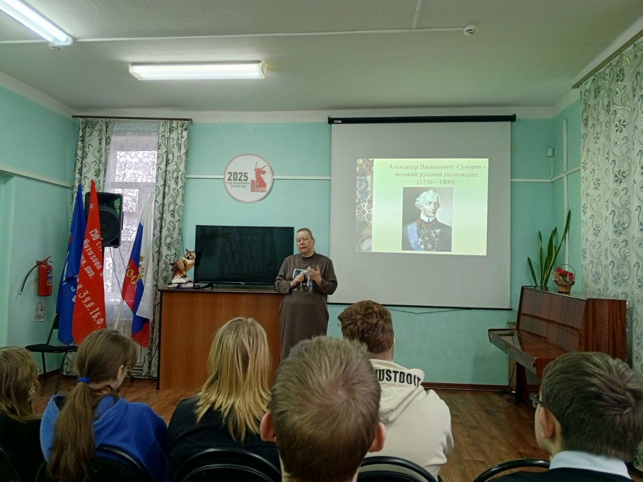 9 декабря, в День Героя Отечества, в Сычевской центральной межпоселенческой детской библиотеке прошло патриотическое мероприятие «Непобедимый Суворов». Библиотека предложила гостям-девятиклассникам игровую программу, посвящённую памяти великого русского полководца Александра Васильевича Суворова, в которой присутствовали познавательные элементы.
