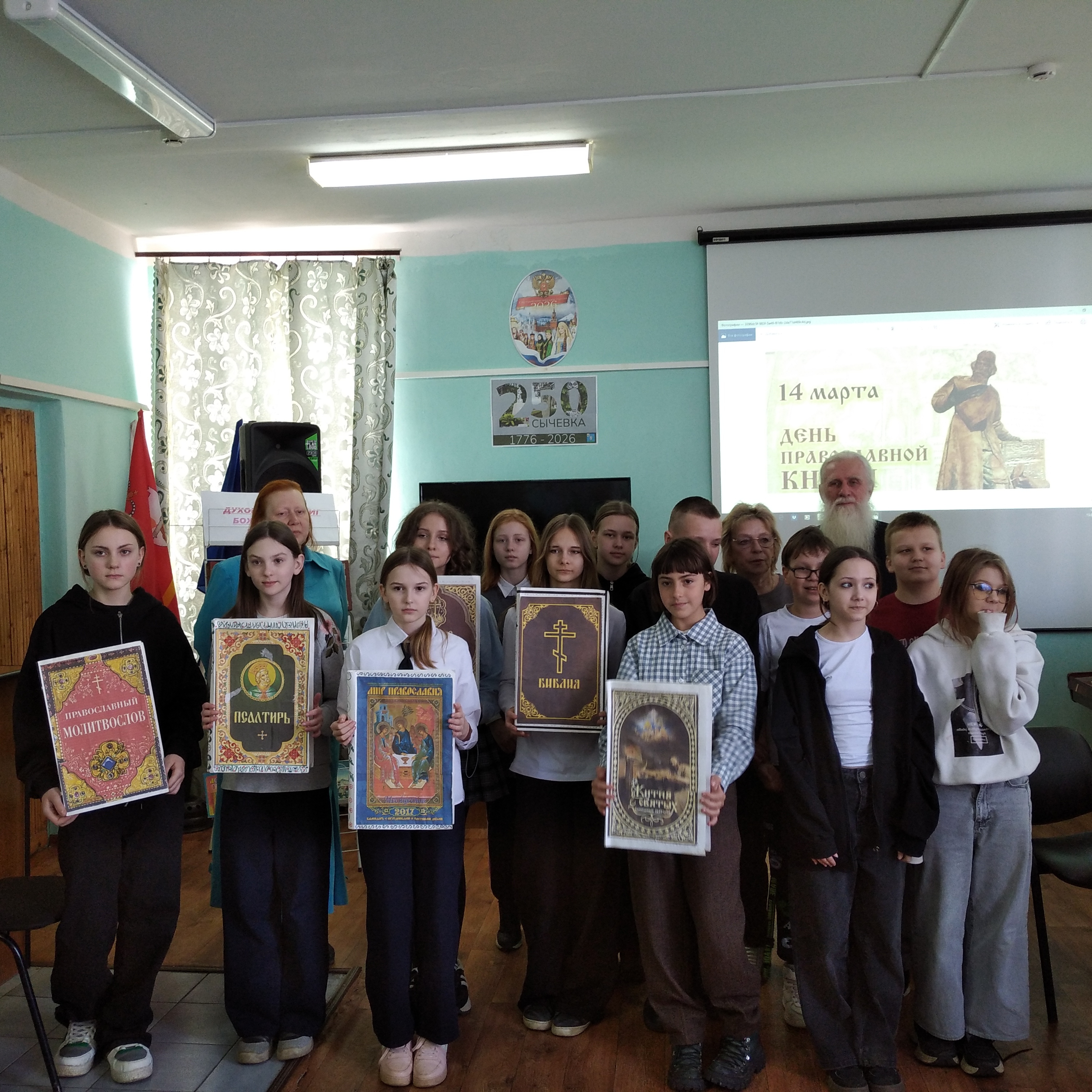 Духовных книг божественная мудрость. Под таким названием прошел в Сычевской ЦМДБ православный праздник, посвященный Дню православной книги. В мероприятии приняли участие: благочинный Сычевского и Новодугинского округов протоиерей отец Анатолий (Чайкин), хор Воскресной школы «Радуга» при Свято-Благовещенском храме, преподаватели ДШИ и пятиклассники школы №1 г.Сычевка. Школьники узнали историю праздника, познакомились с православной литературой, представленной на книжной выставке, посмотрели небольшое видео о самой древней книге, найденной археологами. Особый интерес вызвал рассказ батюшки о Библии и ее загадках. Завершил праздник о.Анатолий, он подарил ребятам православные брошюры. Достойным обрамлением праздника стало выступление хора под руководством Гульевой Ирины Анатольевны и аккомпанемент Ермолаевой Оксаны Александровны.