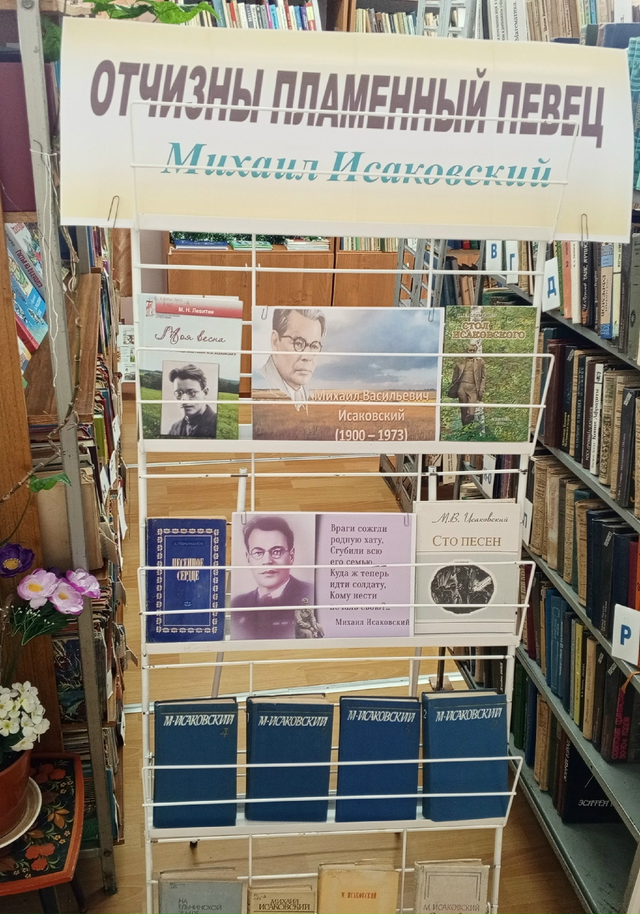 В Сычевской центральной межпоселенческой детской библиотеке организована тематическая книжная выставка «Отчизны пламенный певец», посвящённая творчеству Михаила Васильевича Исаковского. На экспозиции представлены его произведения, включая сборник «Сто песен», книгу «Письма о литературе» и автобиографические страницы «На Ельнинской земле». Михаил Исаковский прожил плодотворную творческую жизнь и неоднократно был удостоен высоких государственных наград. Творчество поэта тесно связано с историей и культурой нашей страны. Его стихи, воспевающие жизнь и подвиги народа, широко известны и звучат в России повсеместно.