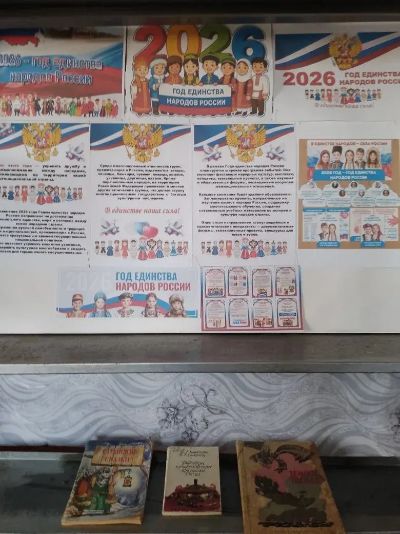 Библиотекарь Моховаткинской поселенческой библиотеки оформила иллюстрационно - книжную выставку "Год единства народов России". Цель этого года - укрепить дружбу и взаимопонимание между народами , проживающими на территории нашей многонациональной страны . Сохранить русскую самобытность и традиции всех национальностей , проживающих в России.