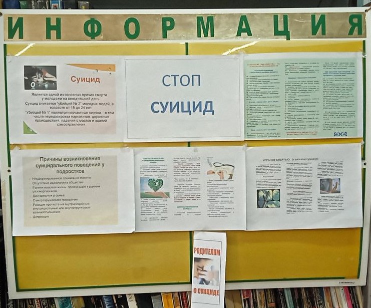 Суицид – умышленное самоповреждение со смертельным исходом. Решаются на такой шаг, как правило, замкнутые, ранимые подростки от ощущения одиночества, собственной ненужности и утраты смысла жизни. В Караваевской библиотеке оформлен информационный стенд по профилактики суицидального поведения «Стоп суицид». На стенде размещены памятки «Что такое суицид», «Виды суицидального поведения», «Основные причины», «Признаки суицидального поведения», «Советы для родителей».