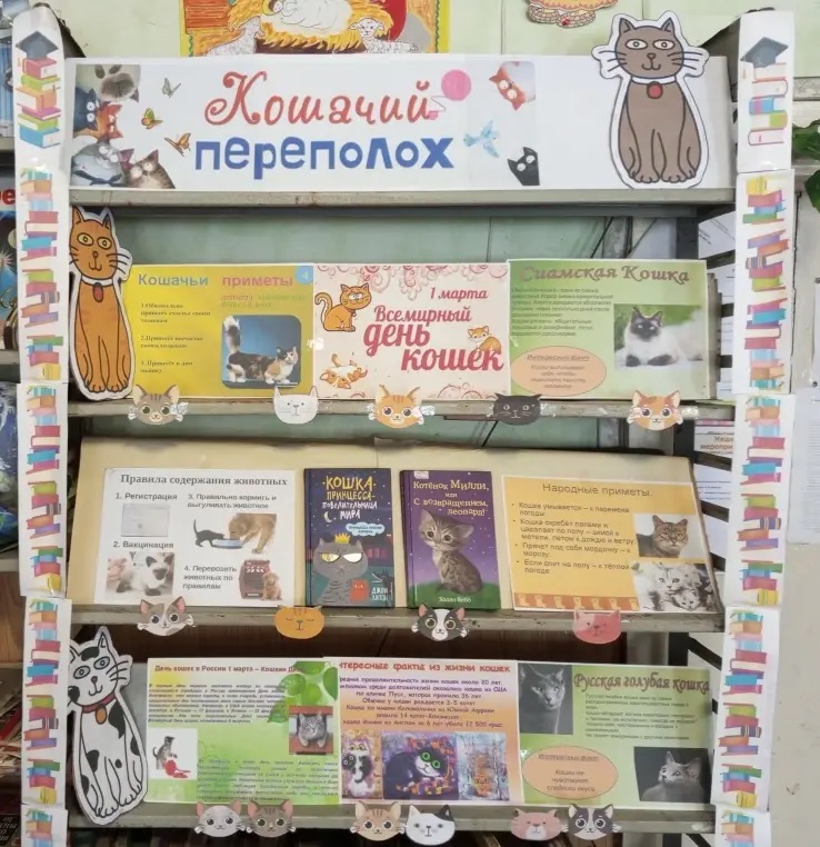 Кошки — грациозные творения природы, ставшие символом домашнего тепла и уютного вечера у камина. Ежегодно 1 марта отмечается Всемирный день кошек. Этот праздник призван привлечь внимание широкой общественности к вопросам правильного ухода и содержания домашних животных. Выбор кошки в качестве международного символа праздника вполне закономерен: именно эти пушистые четвероногие любимы подавляющим большинством населения нашей планеты. К этому событию библиотекарь Середской библиотеки подготовила выставку под названием «Кошачий переполох». На выставке представлены книги «Кошка-принцесса», «Котёнок Милли», а также полезные памятки о правильном уходе за кошками и особенностях их поведения.