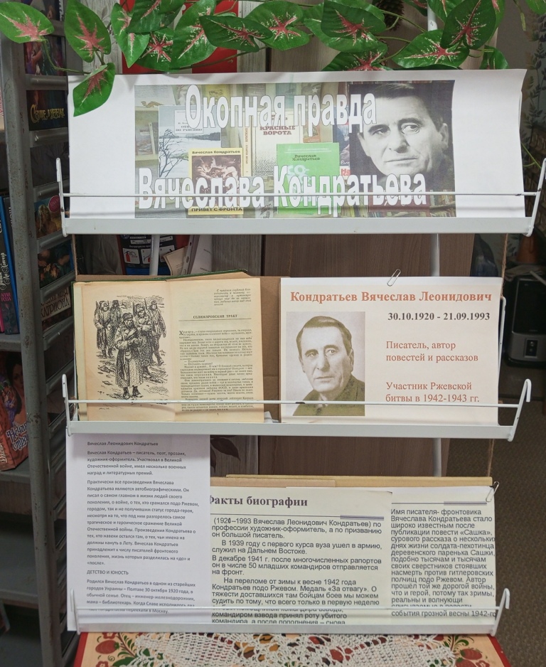 30 октября исполняется 105 лет со дня рождения Вячеслава Леонидовича Кондратьева, писателя, который участвовал в Великой Отечественной войне. В Никольской поселенческой библиотеке к этой дате оформлена книжно-иллюстрированная выставка «Окопная правда Вячеслава Кондратьева». На выставке можно найти информацию о жизни и творчестве писателя, а также познакомиться с его сборником повестей и рассказов «На поле Овсянниковском». В своих книгах писатель показывает, как выглядела война глазами обычного солдата. Он рассказывает о боли, страхе и ужасе, которые испытывали люди на фронте. Эти произведения помогают лучше понять, что пережила наша страна во время Великой Отечественной войны, и остаются важной частью русской литературы XX века.