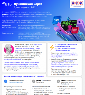 Необходимо перевыпустить «Пушкинскую карту» в Банке ВТБ (ПАО).